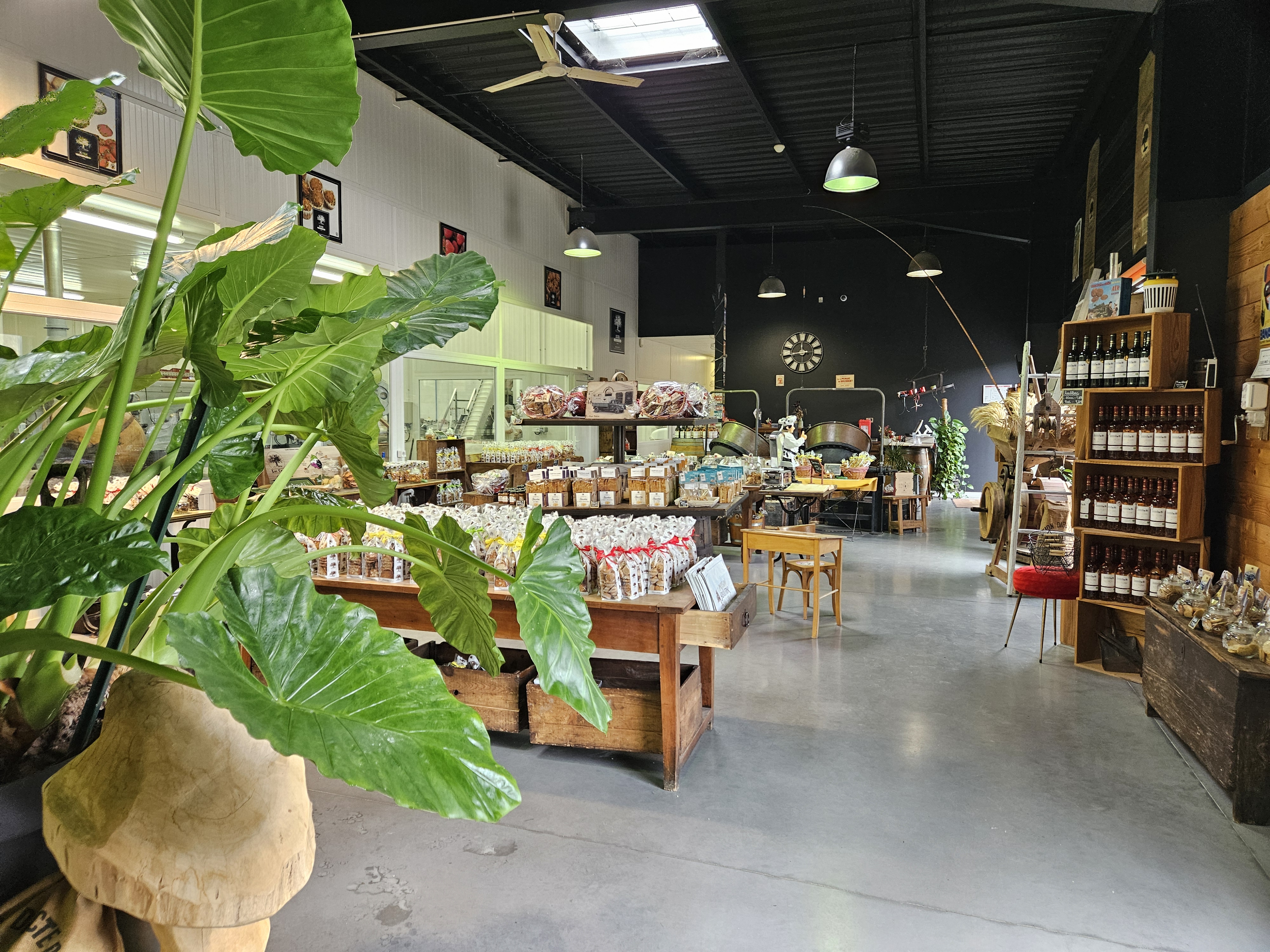 Il y a un petit bar, on peut observer l'entiereté de l'usine par des fenêtres, ce qui permet aux clients de voir comment est conçu leur produit. Je recommande vivement d'y aller pour boire un chocolat, café ect en achetant un petit paquet de biscuit, evidemment local et bio ! Bravo!!