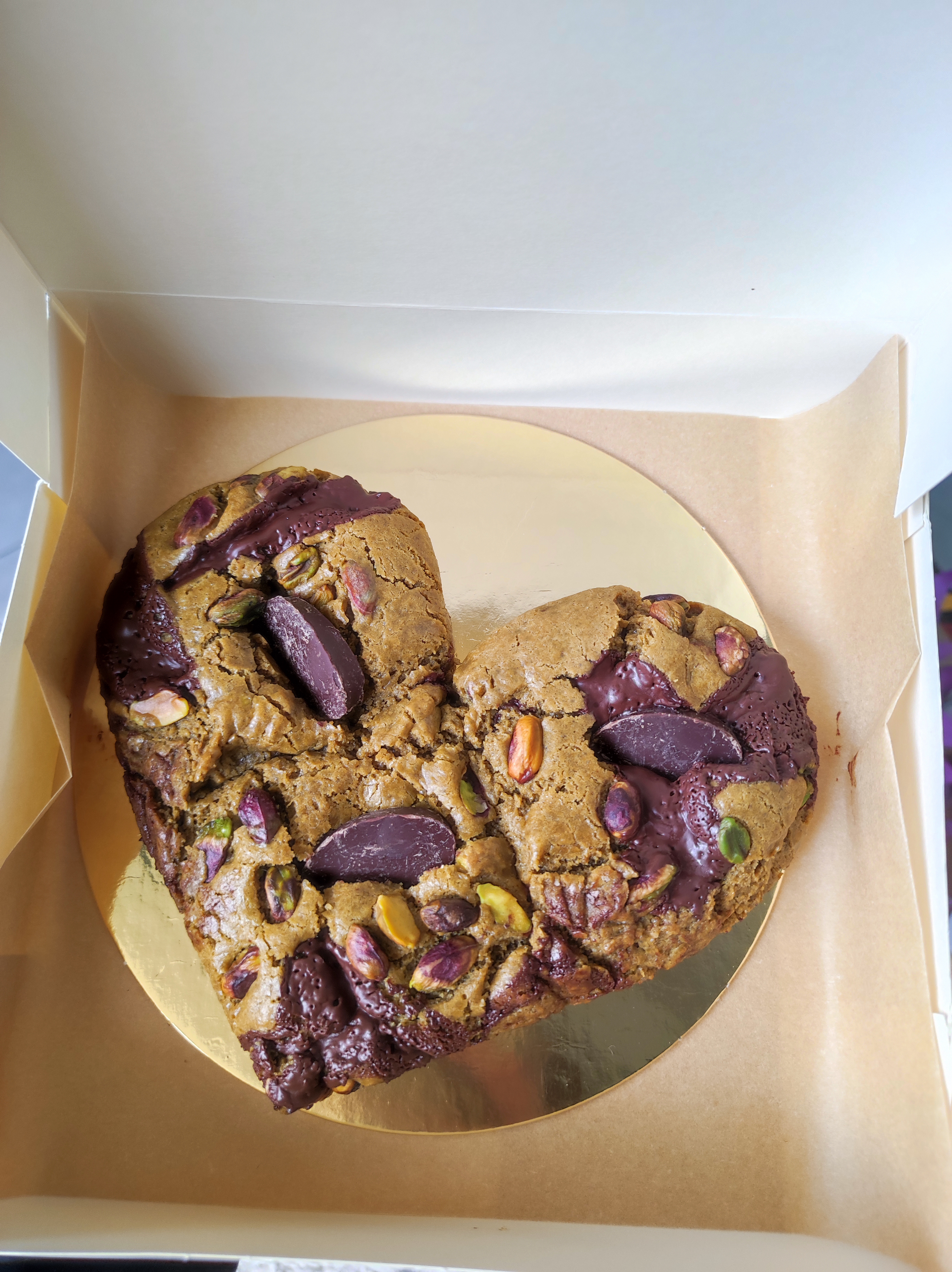 Première fois que je teste cette boutique, j'ai goûté le cookie coeur à la pistache, je pense que c'est une édition limitée. Il était vraiment très gros mais super bon comme je les aime (croustillant à l'extérieur et moelleux à l'intérieur). Le cookie est généreusement garni mais seul bémol la pistache est un peu discrète par rapport au chocolat.